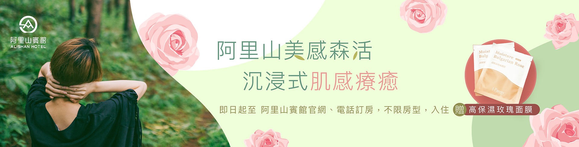 我们以美感新森活为题,凡于阿里山宾馆官网、电话订房入住,即赠玫瑰精油芬芳的高保湿润泽面膜,沉浸在桧木、森林、玫瑰花香旅程,我们衷心期盼,这片来自大地恩赐的森林浴、玫瑰芳香,为您的旅途增添焕彩与亮丽丰采,让旅行不再是奔波,而是放慢脚步享受简单、纯粹、有感的美好!